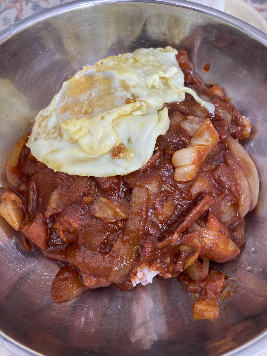 앙파와 오징어를 잘게 썰어 넣은 진한 짬뽕소스가 밥 위에 얹어 있다. 밥이 설익었는지 퍽퍽하다. 소스도 진하다. 전체적으로 중국집의 짜장밥과 비슷한데 비주얼이 빨갛고 고기대신 오징어가 들었다.